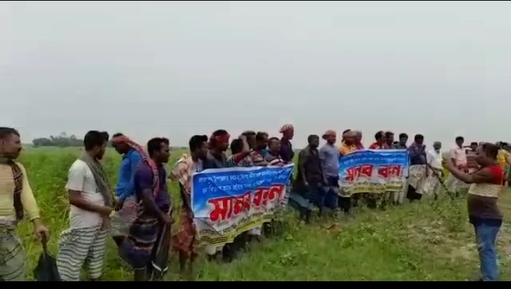 নাটোরের লালপুরে পদ্মার চরাঞ্চলে কৃষকদের আবাদি জমি অবৈধ ভাবে দখল করে উপজেলা বন বিভাগের পক্ষ থেকে বনায়ন প্রকল্প করার প্রতিবাদে মানববন্ধন কর্মসূচি পালন করেছে কৃষকরা সহ জমি রক্ষা কমিটির নেতা—কর্মীরা।